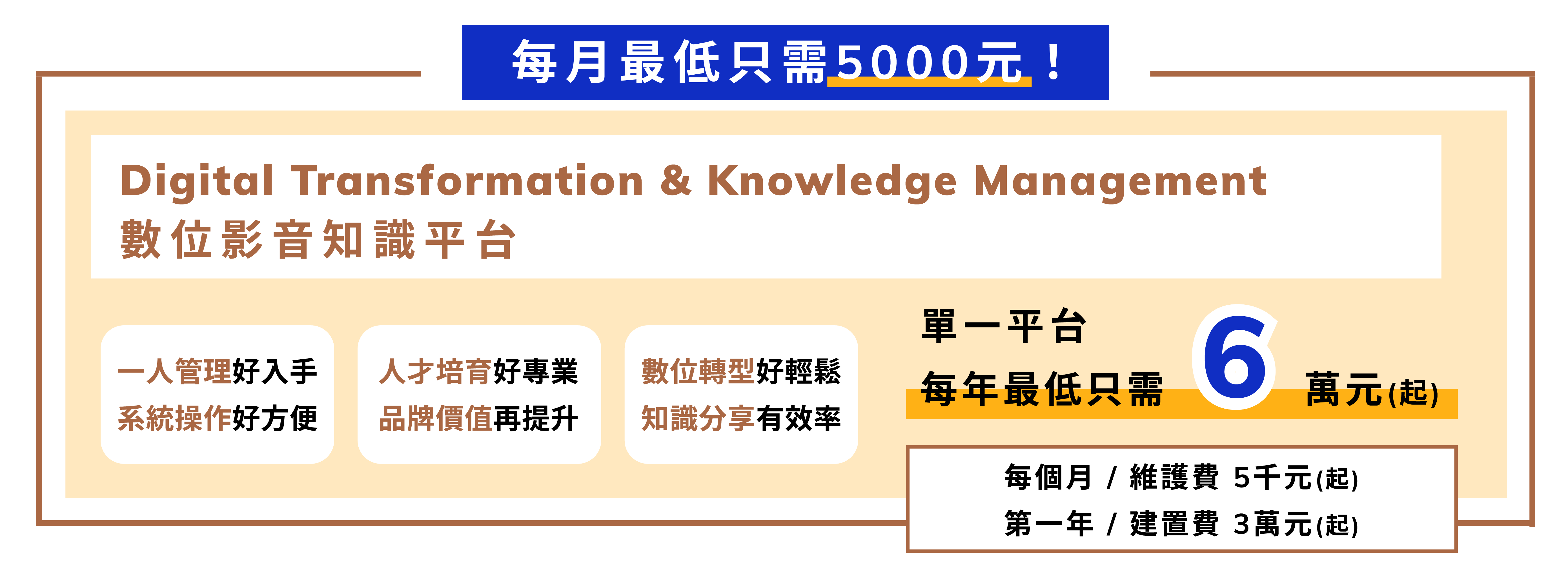 透過數位影音平台輕鬆分享,提供學員、客戶不受空間與時間的數位知識學習及線上課程經驗。